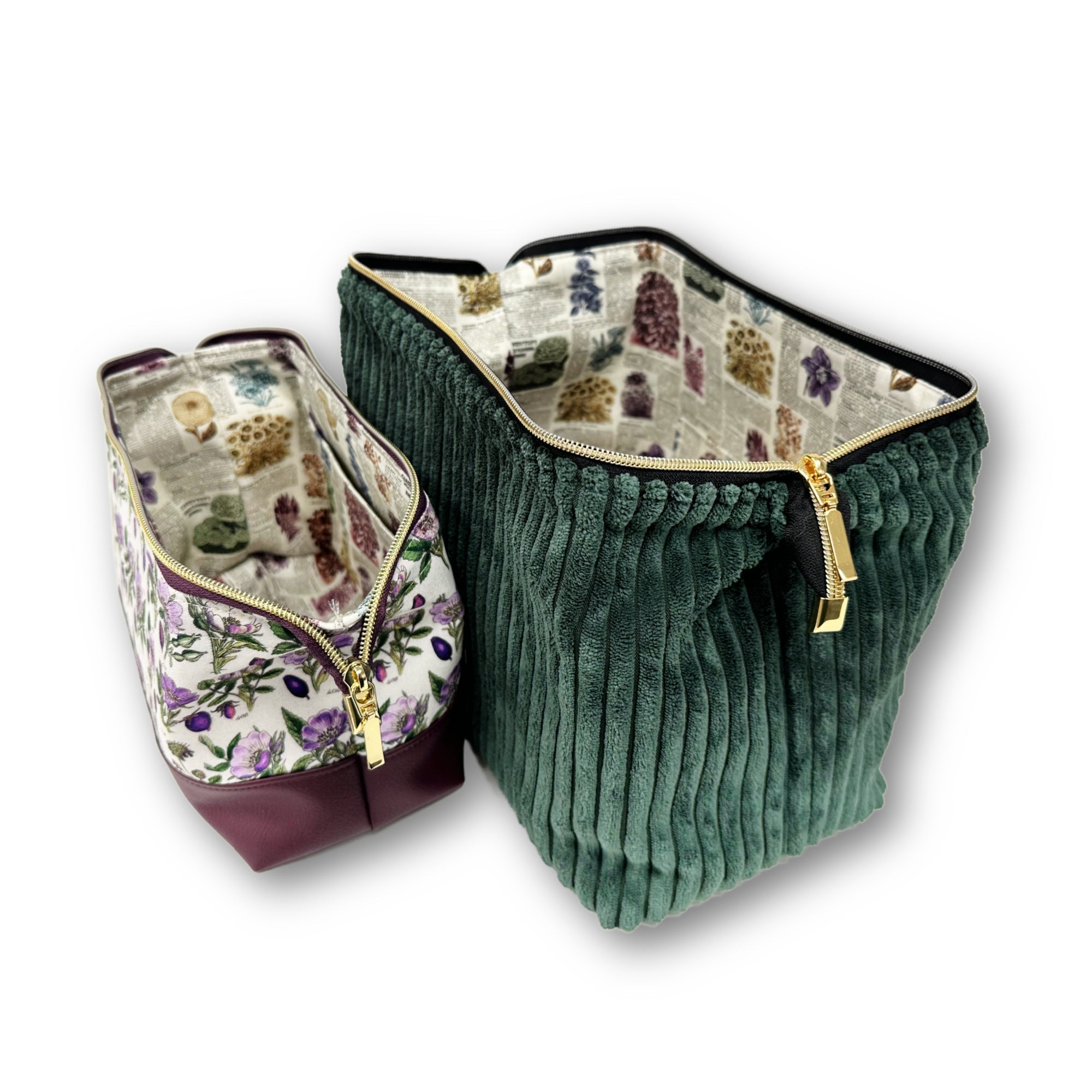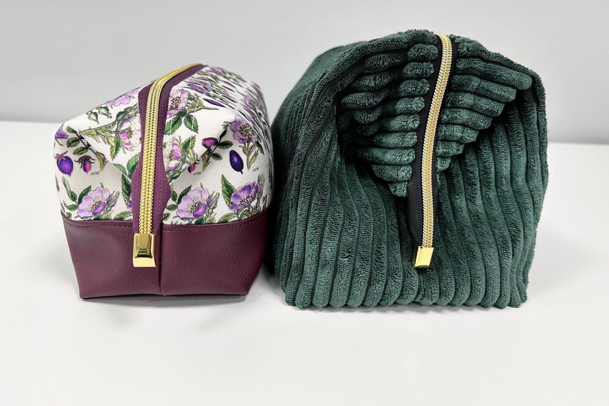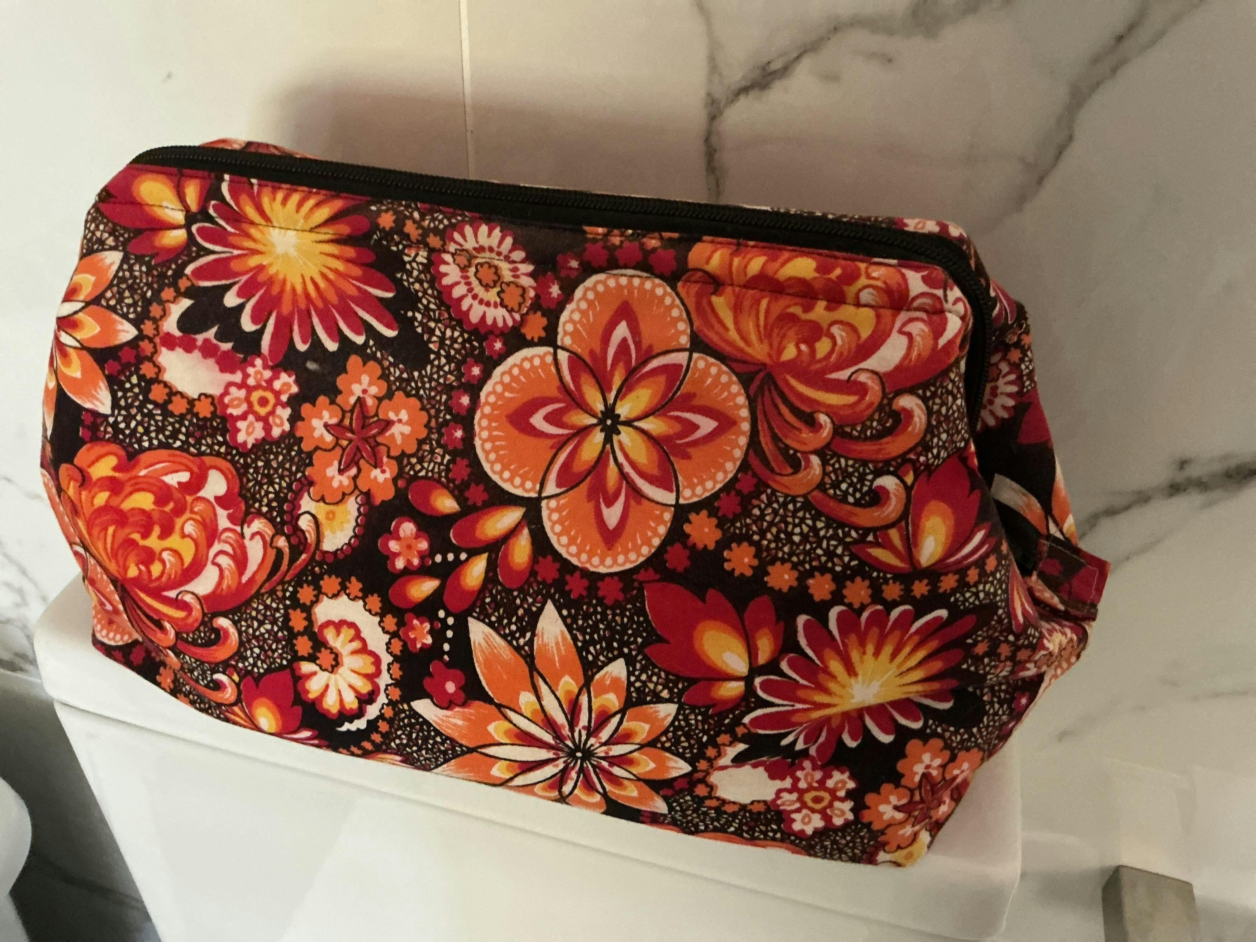 The Retreat Bag is a simple zippered pouch with a wide base and a wide structured opening. There is a casing in the top where you insert two wire frames (one on each side), which helps it stay open when open, and helps turn the corners down when closed. It has two optional slip pockets inside and a long zipper that helps it open wide.