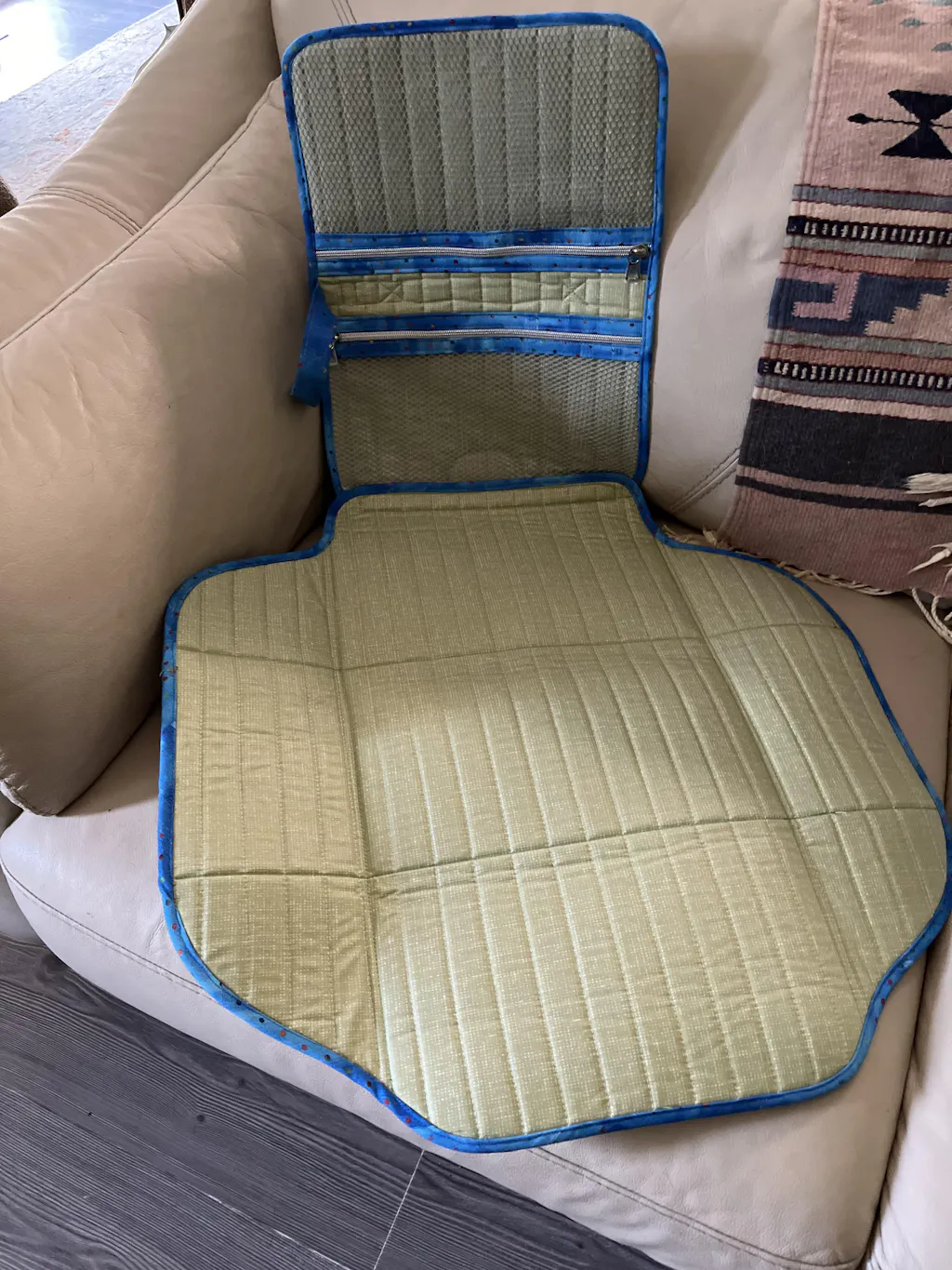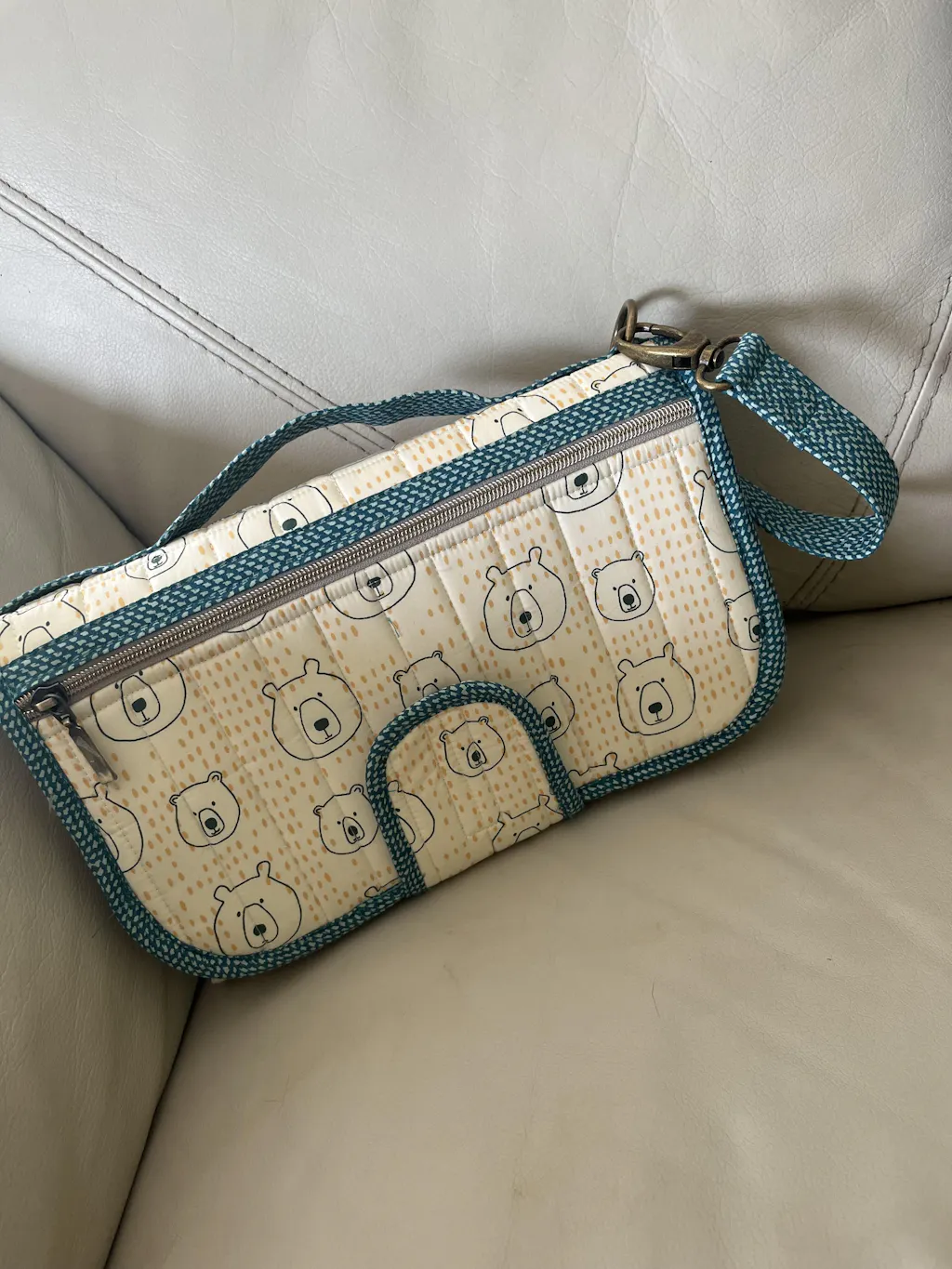 The extra-large baby changing pad is fully padded to provide comfort for your little one. The pad removes for easy laundering or to allow the clutch to be used separately. The pattern includes instructions for using PUL (polyurethane laminate) fabric to make a pad with a wipe-clean lining.
