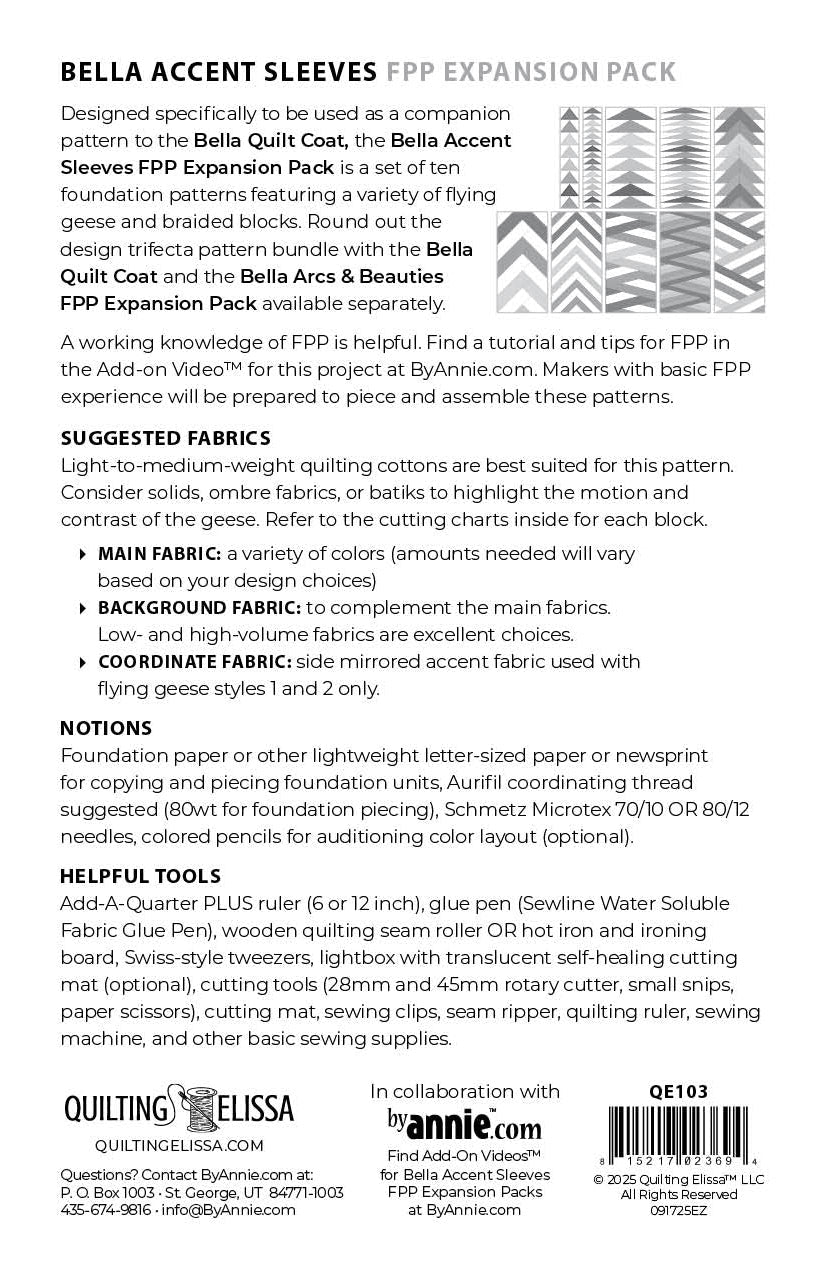 The Bella Accent Sleeves FPP (foundation paper piecing) Expansion Pack is designed specifically to be used as a companion pattern to the Bella Quilt Coat.