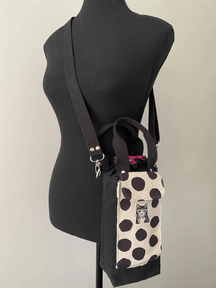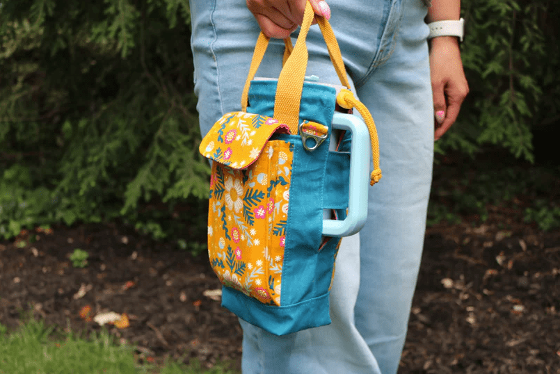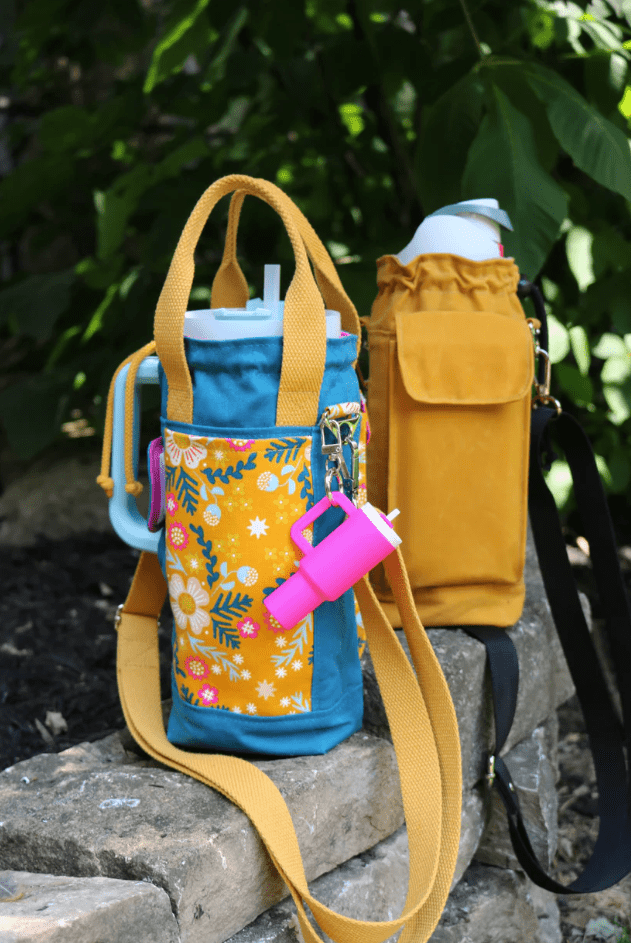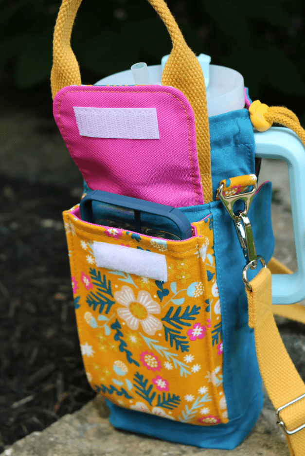 The Brooke Bottle Holder has clean & simple construction, making it great for beginners. It has a roomy exterior cargo pocket that expands to hold a cell phone & is secured by a flap with hook and loop fasteners.  The opposite side of the bag has a slip pocket for easy access to lip balm, ear pods, or keys.  The interior has options for a plain lining or card slots to carry an ID & credit cards around.  The adjustable crossbody strap is perfect for keeping you hands-free & the top rolled handles allows for a close carry option too. With so many different bottle sizes & styles in the market, the drawstring cinch top allows you to secure them into place. If you love mug style tumblers, the side tab closure tucks underneath the handle, so you can still grip them with ease.  Best of all, the bag has a clean finish for a smooth lining.