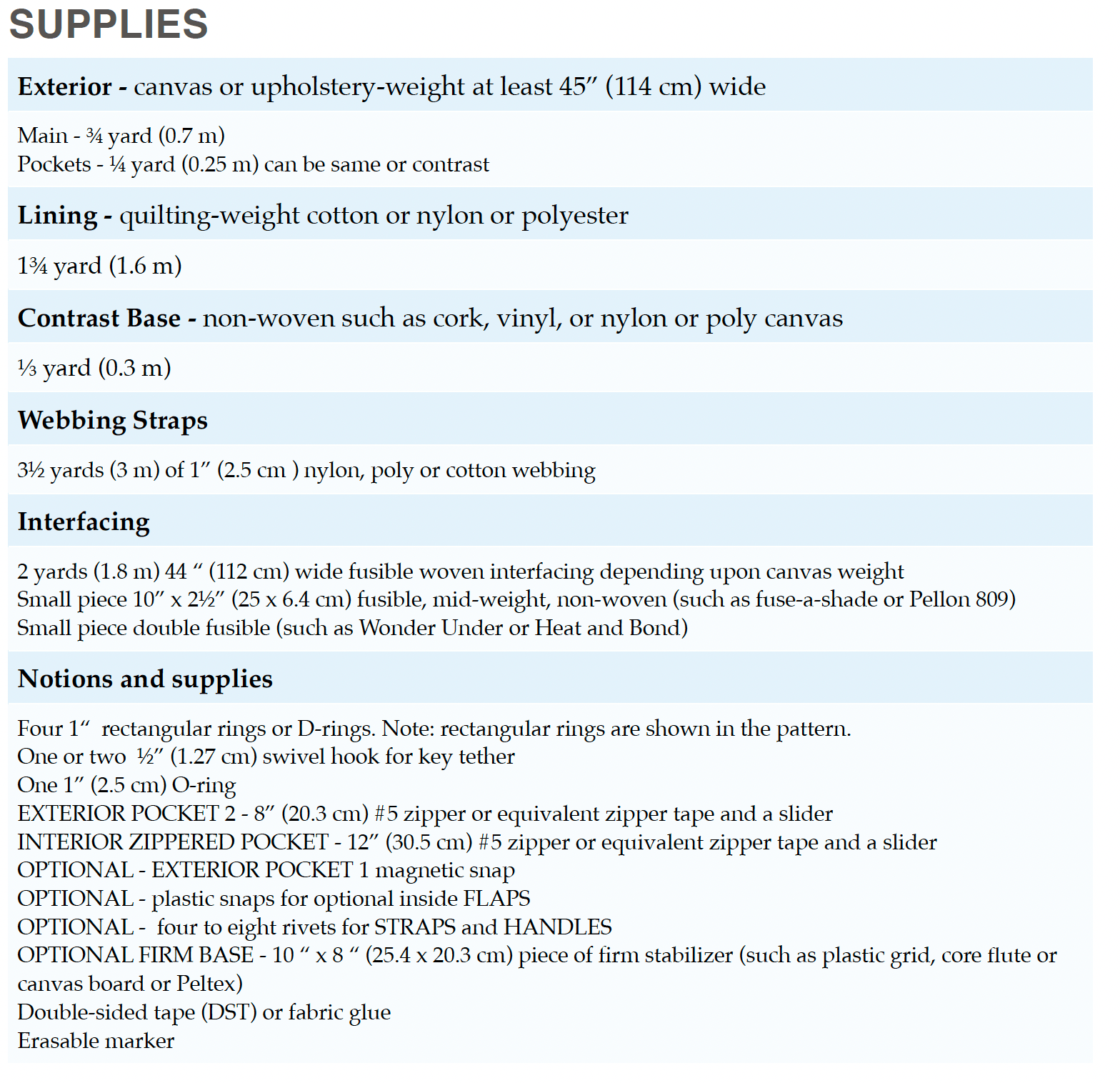 BIG is suited to a variety of sturdy exterior fabrics such as upholstery fabric or canvas. The contrast base can be made with cordura, nylon, polyester, or vinyl if your machine is up to it.