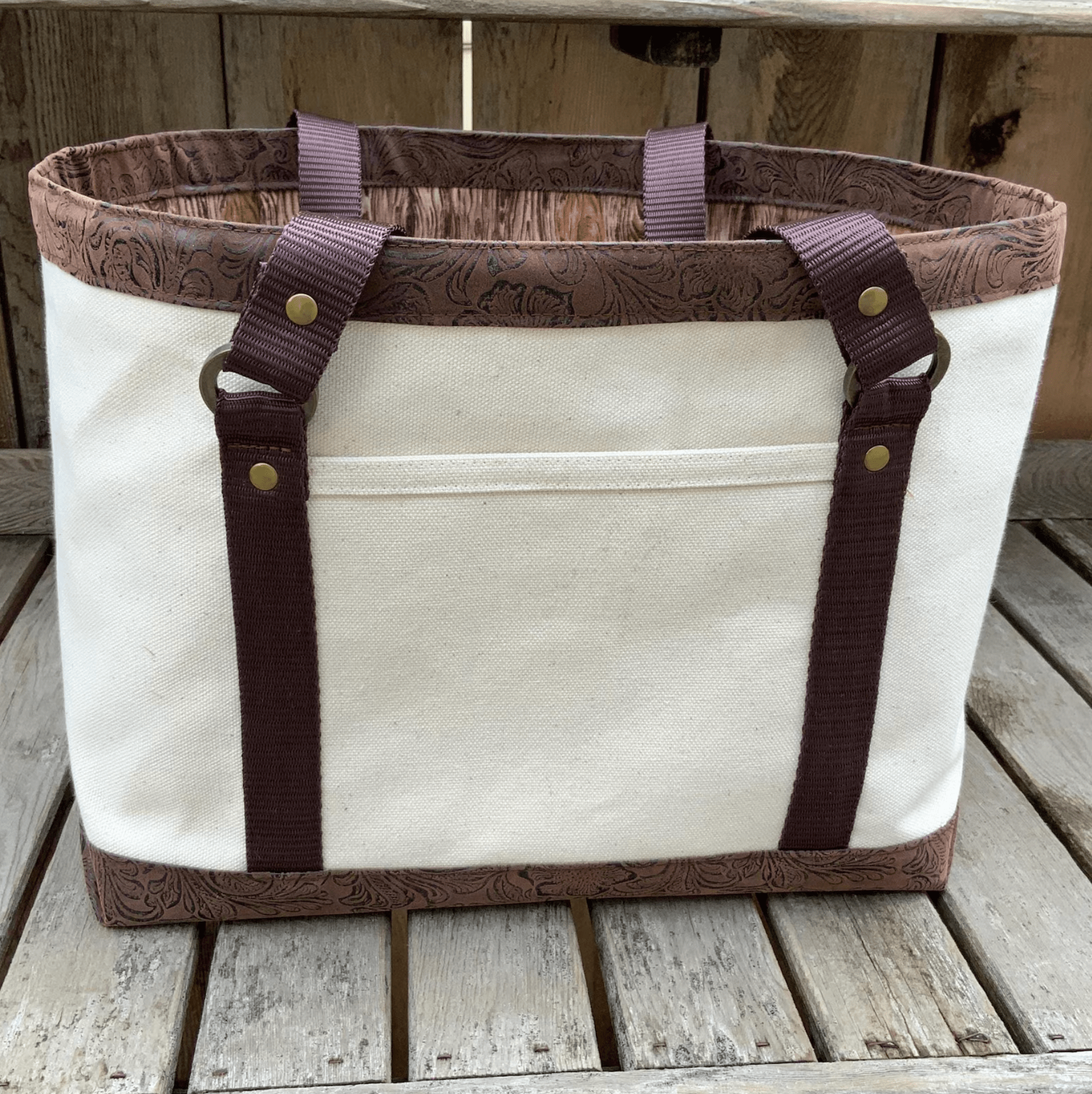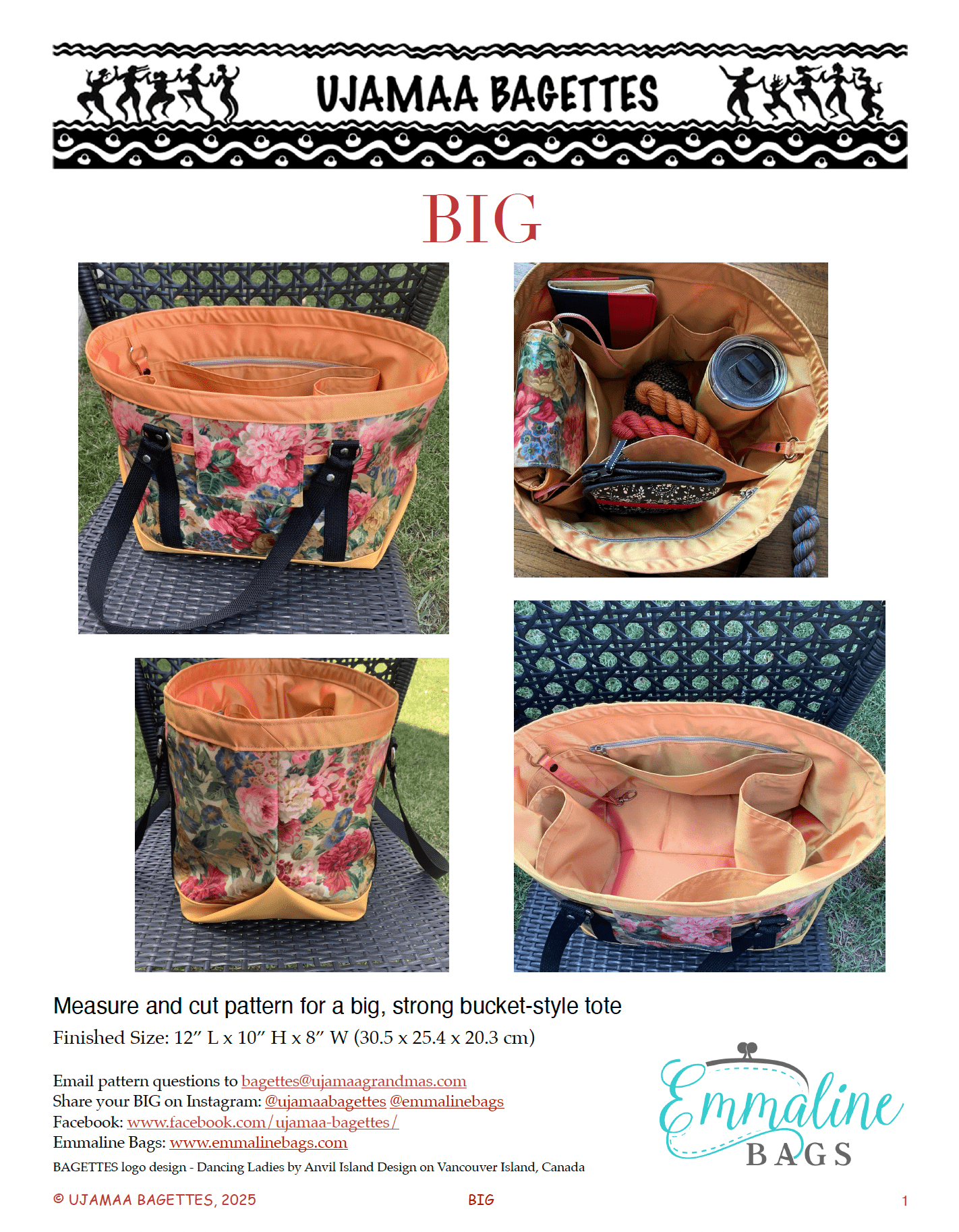 BIG is a hefty, everyday tote and yes, he’s BIG—12” long x 8” wide and 10” deep (30.5 x 20.3 x 25.4 cm)—which makes this the perfect tote for a trip to the market, or the beach, or the park, or art class, or sewing retreat. Well, you get the idea.