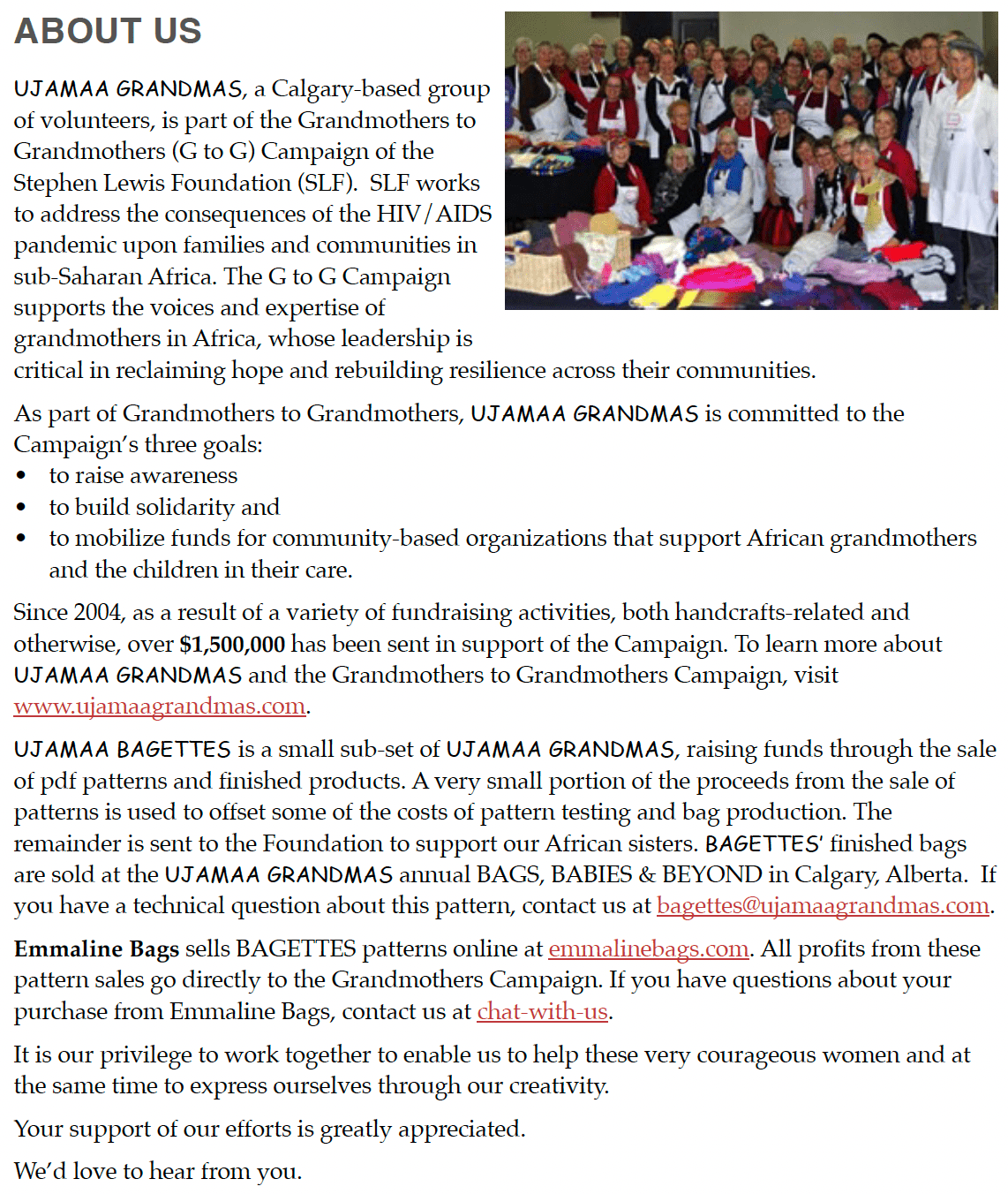 UJAMAA BAGETTES is a small sub-set of UJAMAA GRANDMAS, raising funds through the sale of pdf patterns and finished products. A very small portion of the proceeds from the sale of patterns is used to offset some of the costs of pattern testing and bag production. The remainder is sent to the Foundation to support our African sisters. BAGETTES’ finished bags are sold at the UJAMAA GRANDMAS annual BAGS, BABIES & BEYOND in Calgary, Alberta. If you have a technical question about this pattern, contact us at bagettes@ujamaagrandmas.com.