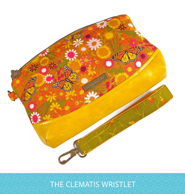 The Clematis wristlet is a great pattern if you are in need of a quick craft show or gift item! It can be made with or without a wrist strap and has one focus fabric on the exterior with a faux leather/vinyl bottom. It has a slightly curved zippered closure that is easy to sew - especially if you've previously made zipper pouches.