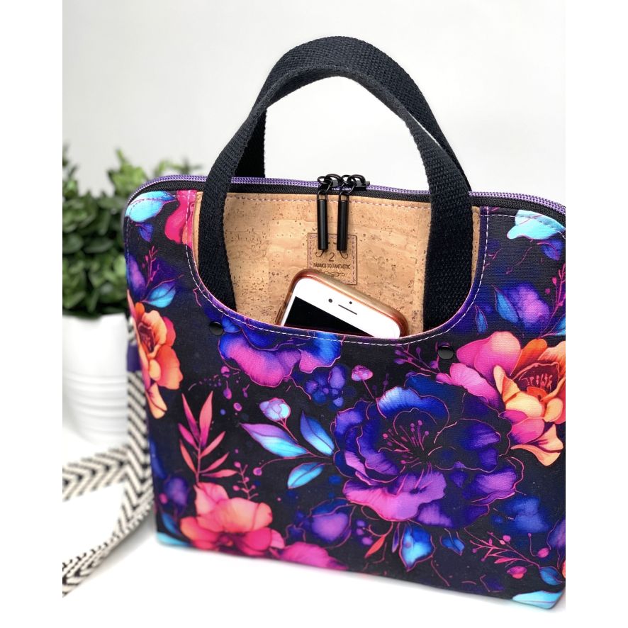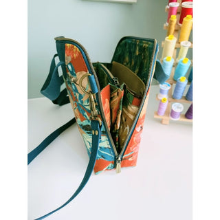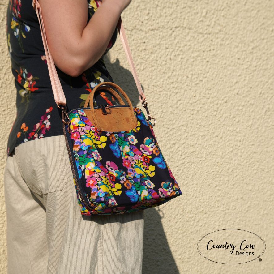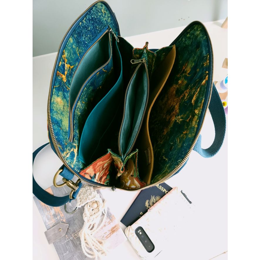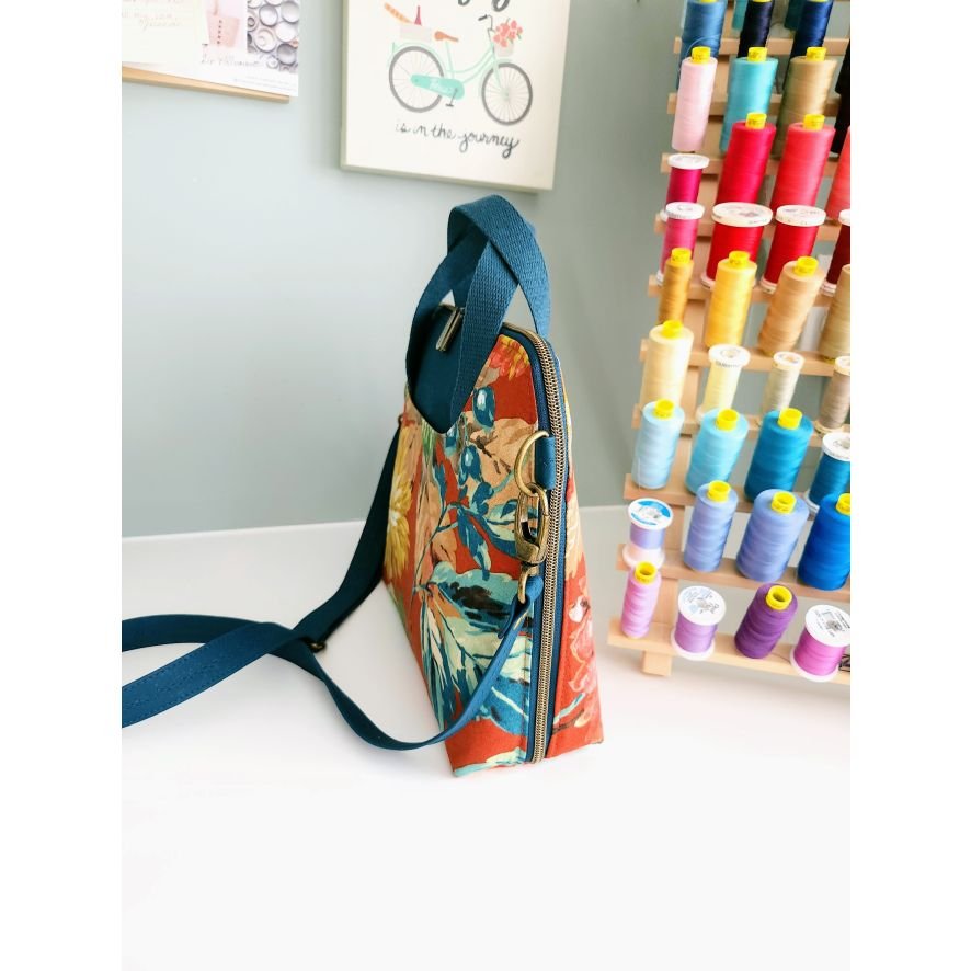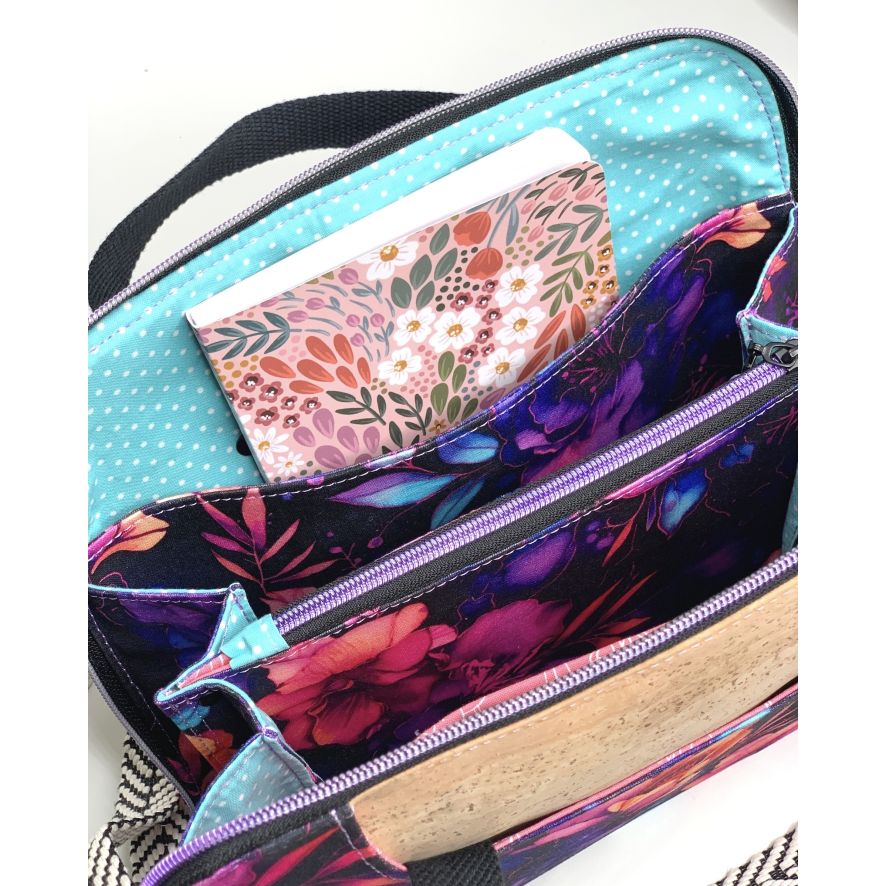 Due to the number of pockets, and therefore layers, in this bag, we recommend quilting cotton as an ideal fabric. Canvas is also great and more experienced sewists may want to give vinyl a try. However, the bag is turned multiple times as we construct it so stiff and sturdy fabrics are not recommended. Cork is only suitable if it is high quality, malleable cork that won't crack when turned multiple times. Thin or flexible vinyl or leather will work but they will make the construction process considerably more difficult so we only recommend these for experienced bag makers.