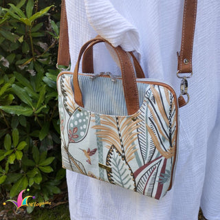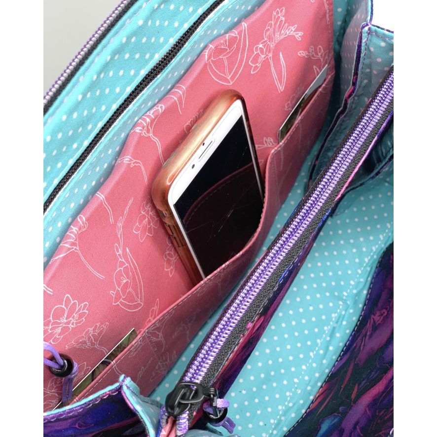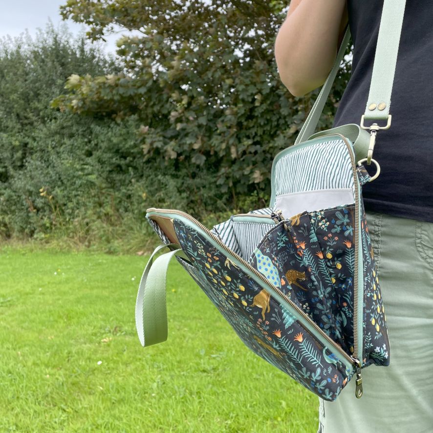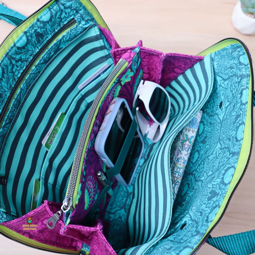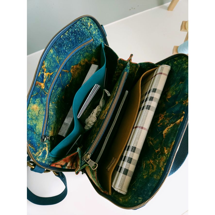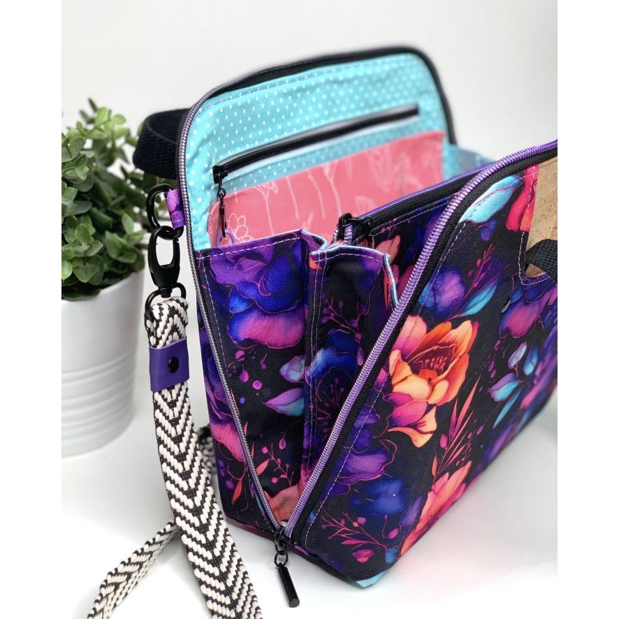 Due to the number of pockets, and therefore layers, in this bag, we recommend quilting cotton as an ideal fabric. Canvas is also great and more experienced sewists may want to give vinyl a try. However, the bag is turned multiple times as we construct it so stiff and sturdy fabrics are not recommended. Cork is only suitable if it is high quality, malleable cork that won't crack when turned multiple times. Thin or flexible vinyl or leather will work but they will make the construction process considerably more difficult so we only recommend these for experienced bag makers.