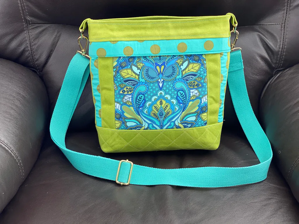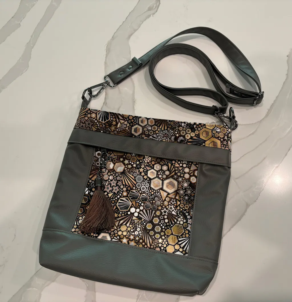The Aspen Crossbody Bag can be made in 2 sizes and features 1 front zipper pocket, and 2 convenient back slip pockets. It has a top zipper opening to keep all of your items safe inside. Inside is a double slip pocket and a zipper pocket for personal items. While this bag has a nice feel in your hand due to the added interfacing and fusible Thermolam Plus Fleece, it’s not a heavily structured bag, but a casual crossbody bag.