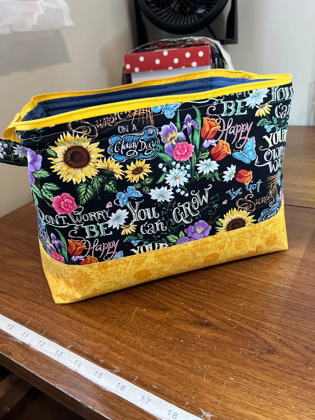 The Retreat Bag is a simple zippered pouch with a wide base and a wide structured opening. There is a casing in the top where you insert two wire frames (one on each side), which helps it stay open when open, and helps turn the corners down when closed. It has two optional slip pockets inside and a long zipper that helps it open wide.