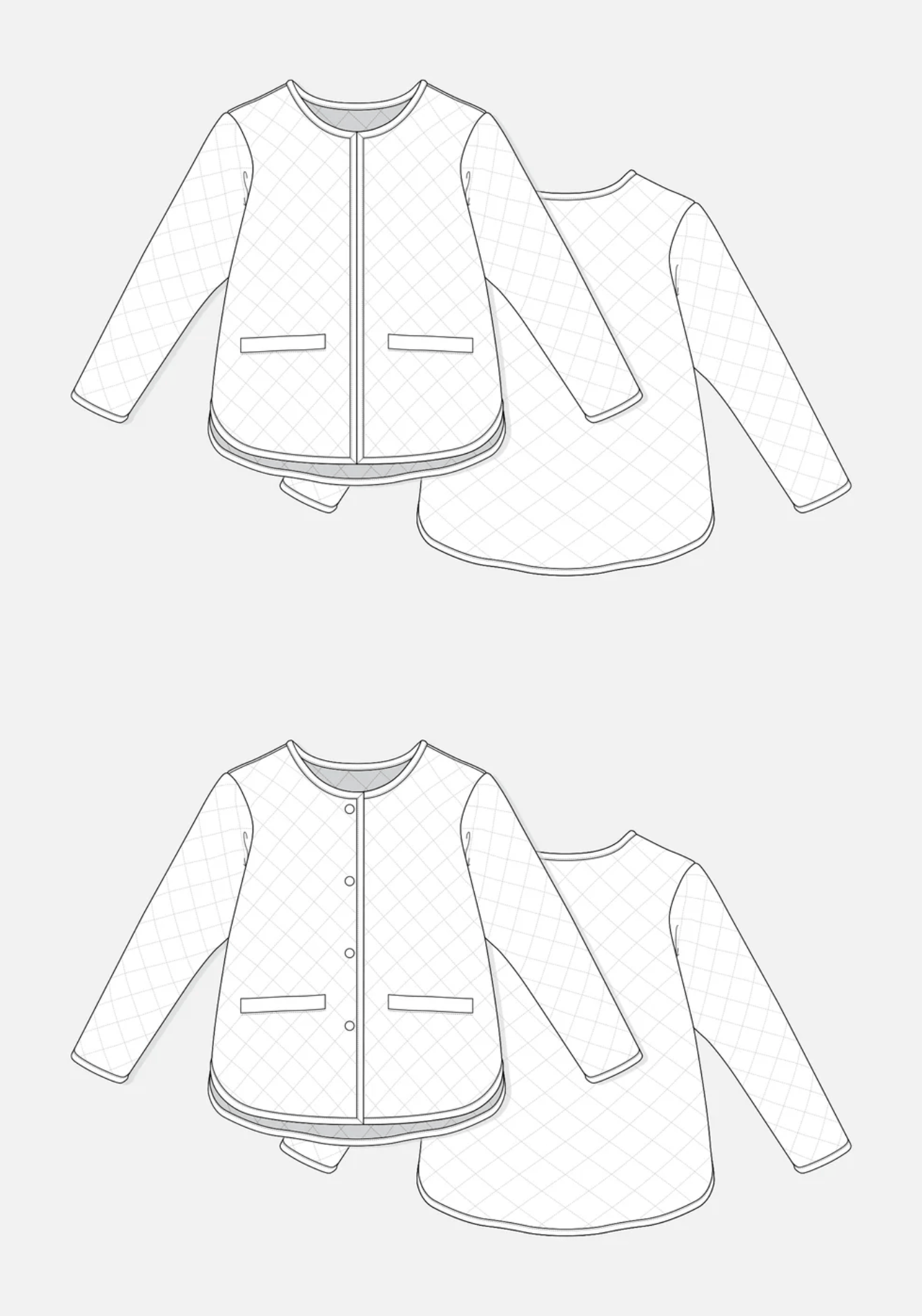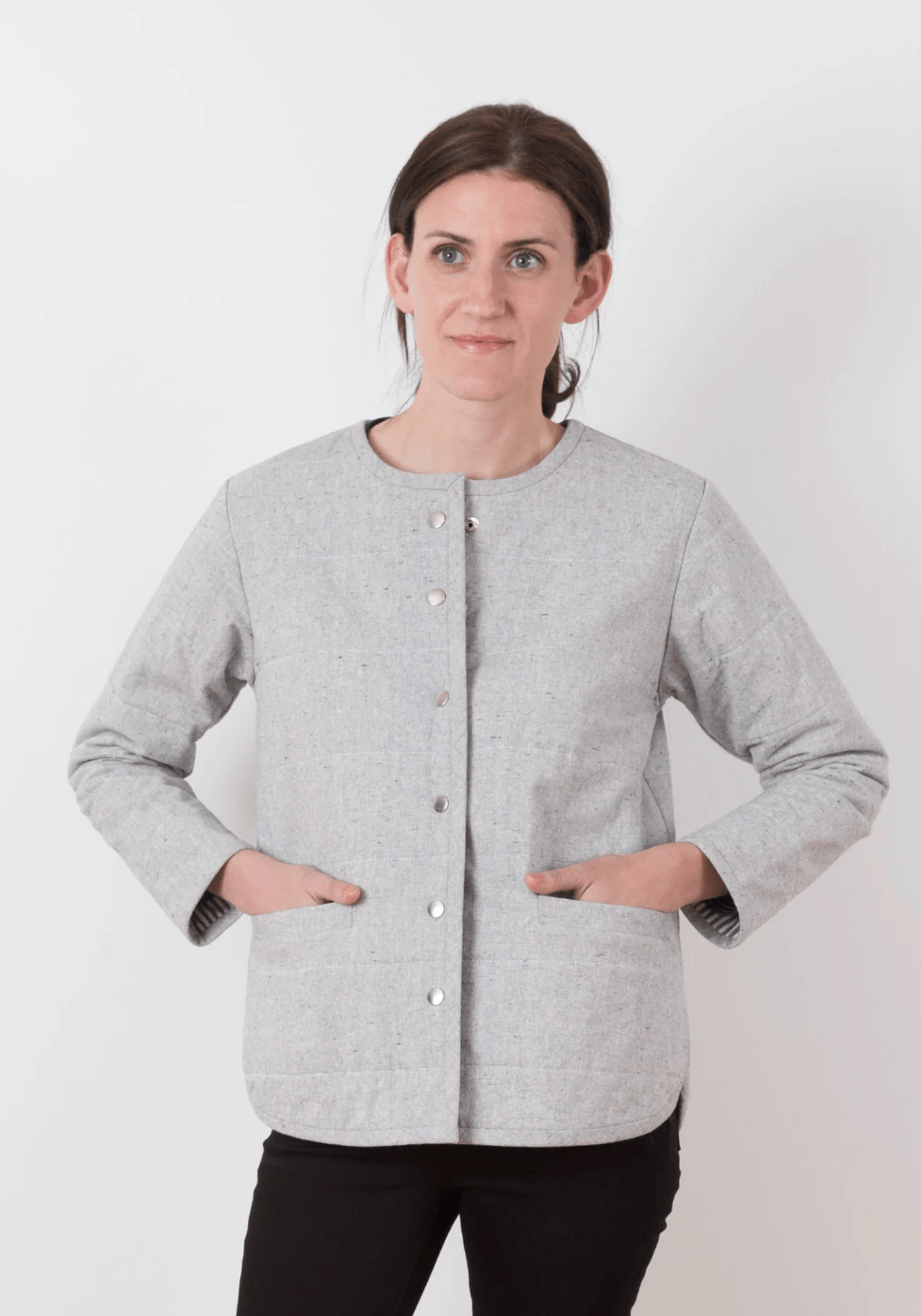 The Tamarack Jacket is a warm and stylish quilted coat perfect for spring and fall layering, designed with transitional seasons in mind. Follow one of the two quilting designs included, or design your own to make your Tamarack totally original to you! You'll stay toasty thanks to the inner layer of cotton or wool batting, while the roomy welt pockets will keep your belongings safe and your hands warm.