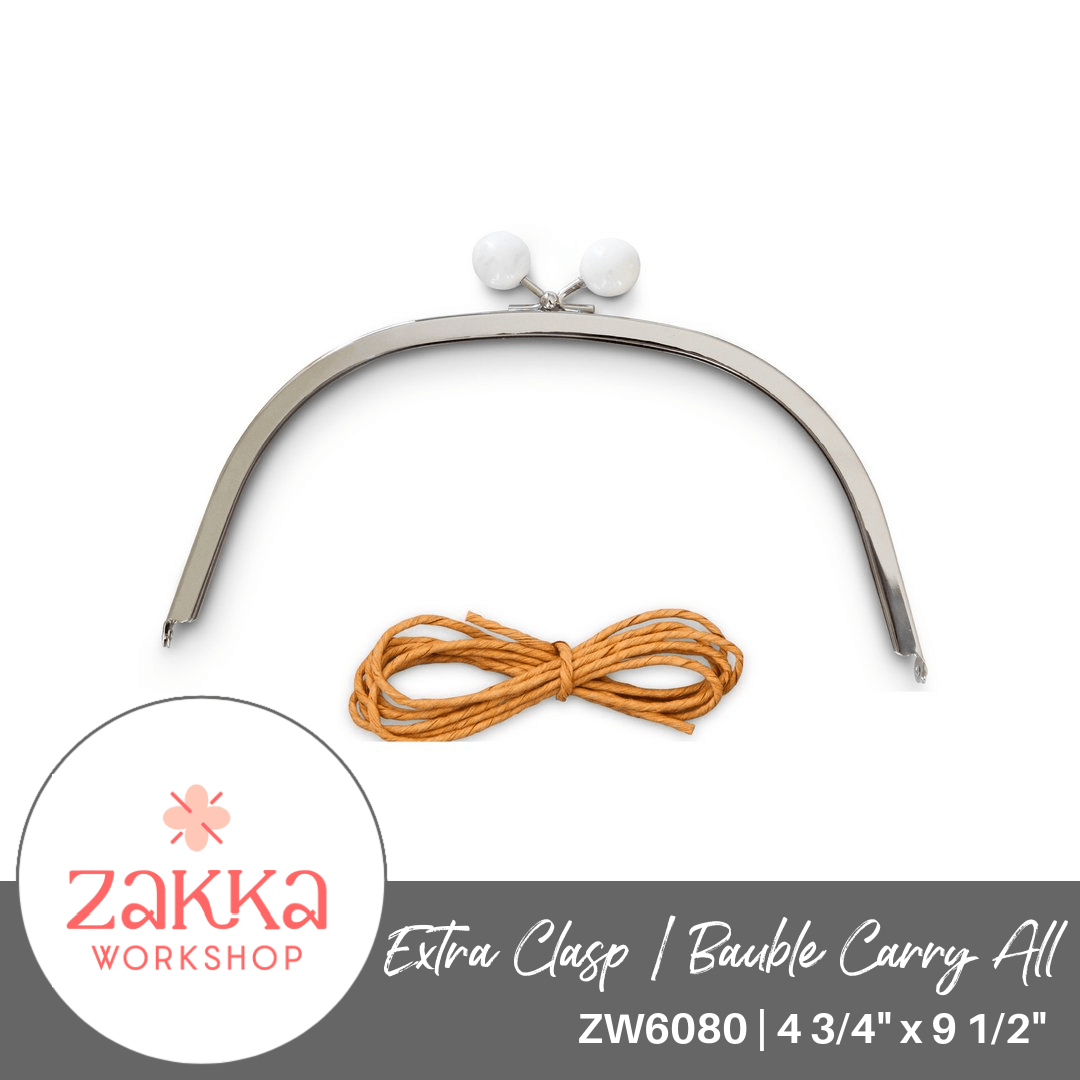 This silver metal glue-in clasp is for the Bauble Carryall Tote featured in The Purse Clasp Book, and can also be used with other patterns. Also includes paper string used for installation.